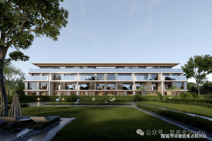 联排立面:采用独特的斜切面设计语言,搭配浅色维纳多石材、灰色印度蓝石材与仿木纹铝板,通过精妙的材质对话,构筑出层次分明、质感丰富的立面表情。大面积的玻璃幕墙消弭了建筑与自然的边界,L形石材露台拓展了生活的场域。