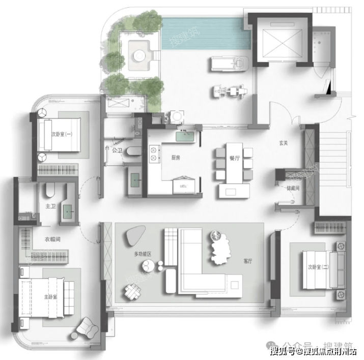 除了超大空中庭院之外,还拥有四房两厅三卫双套设计,餐客厅一体化的LDKG大方厅,开间超6m,面积更达到了近50㎡,超级X空间可以根据需求任意变换成茶室、瑜伽房、儿童乐园等,而双套房也被分开放在两个端头,兼顾了功能性和生活私密度。