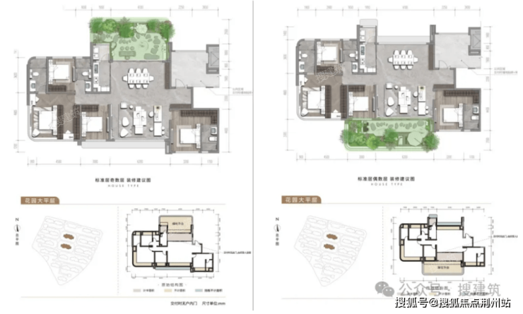 都有约6.3米的庭院挑高,露台+阳台总面积都在30平,都预留约50cm覆土深度,都与室内公区深度结合,客/餐厅得到延伸,自然又流淌进家庭生活的日常。