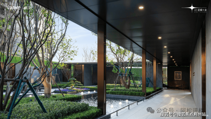 进入小区后,项目精心打造的景观会客厅便跃然眼前了,以定制化铝板、石材打造,点缀以雕塑、罗汉松、水景形成立体的精致中庭景观,廊架围合起来的空间还种植有名贵的乌桕。