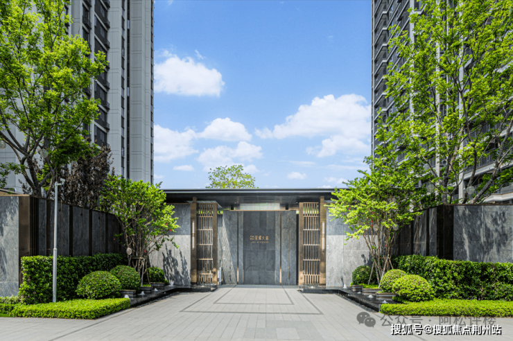 小区东侧门两侧设置有迎宾水景,门头高度达到了8米、以石材与定制化金属搭配而成,呈现出精致、高端的气质。