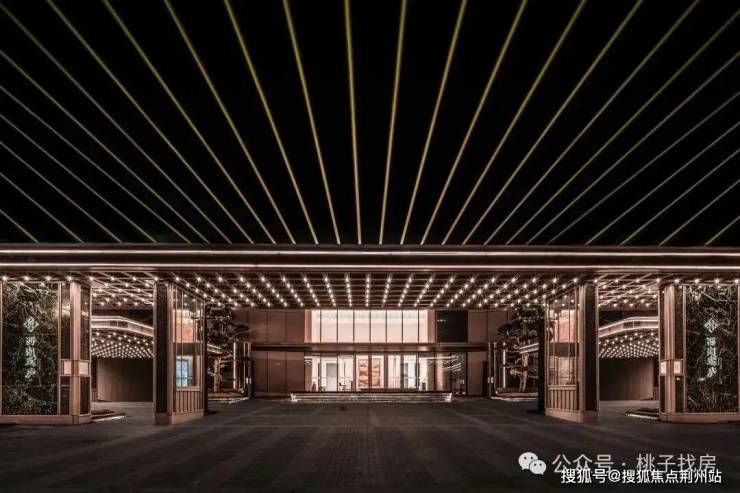 墨绿色的奢石景墙沿着两边对称排开,嵌上了粗细有致的金属线条做分割,底部是人字形纹路的铝板做拼接,到了夜晚,还能看到头顶的「满目星光」。
