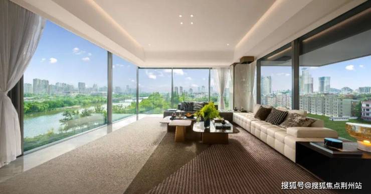 270° 环幕客厅,三面全景落地玻璃,从沙发到餐厅,江景始终如影随形;