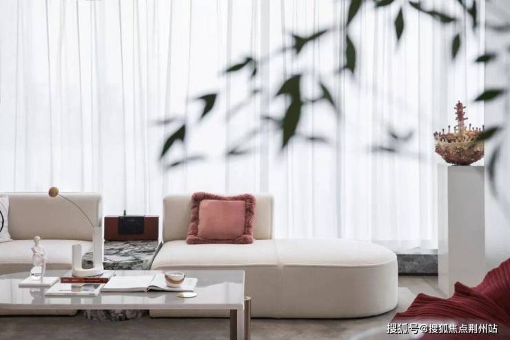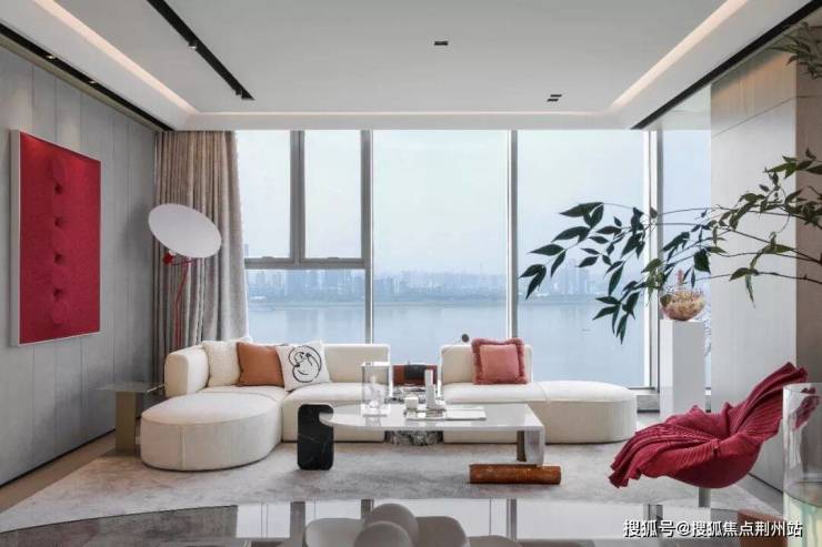 L形沙发的线条流畅,弧度柔和,长江大桥整片风景如一幅画嵌入窗间,凸显出绝佳的景观价值,与艺术家文姝淇的雕塑作品相得益彰。