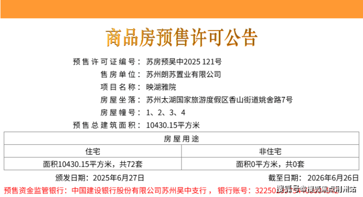 在拿地1年8个月的时候,吴中区环太湖板块的纯新盘太湖朗墅(备案名:映湖雅院)首批次房源取证了。