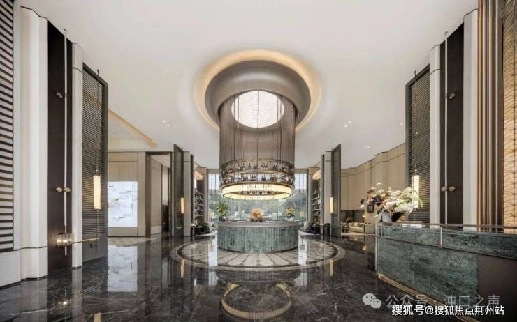 约86米超宽门庭领先经开,尽显大家风范;流金穹顶与奢石肌理相映成趣,勾勒出尊崇气象。