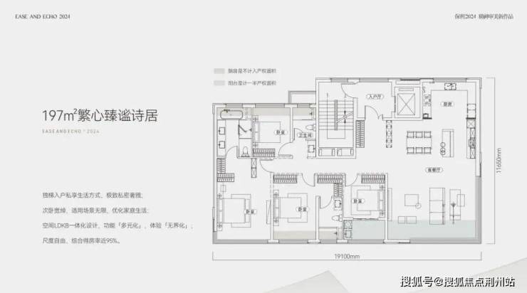 197㎡户型,四房两厅三卫,双套房设计;南向面宽高达19.1米,四面采光通风,通透性极佳;阳台进深约2.4米,双阳台加上多个飘窗,优化后得房率约95%,如果加上电梯前室的面积,得房率也可以做到接近99%。