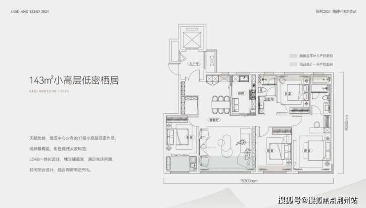 首开的143㎡小高层户型,四房两厅两卫,南向面宽高达15.3米;四开间朝南,客厅开间约5.4米;阳台进深约2.1米,双阳台再加上全赠送的飘窗,优化后得房率约95%,如果再加上约6.6㎡的电梯前室,得房率高达99%。