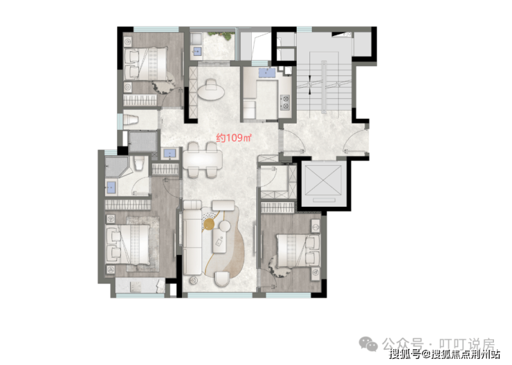 约109㎡,四房两厅两卫,一梯两户。