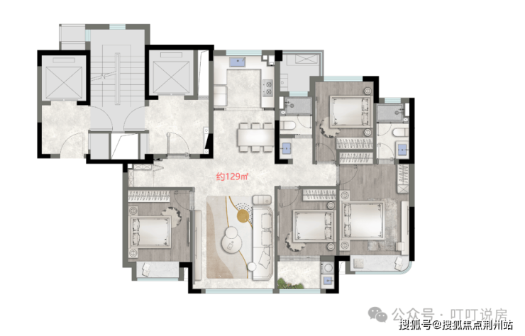 约129㎡,四房两厅两卫,一梯一户和两梯两户。