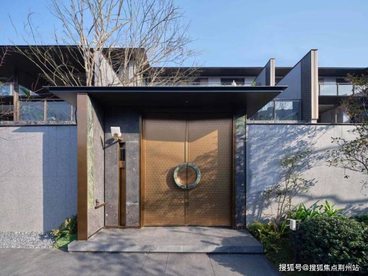 合院入户门上融入了传统东方屏风元素,将玉琮门环、玉石壁灯、玉翎符号等,以高定奢华的细节营造,彰显大户人家的气场。