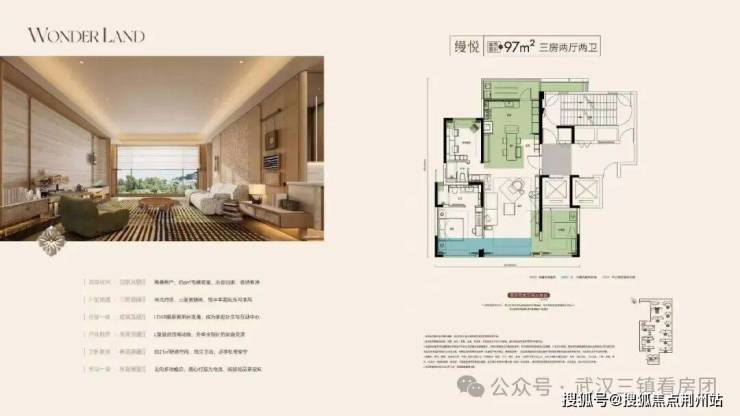 建面约97㎡三房两厅两卫:实得约113㎡,功能三房,LDBK一体化设计