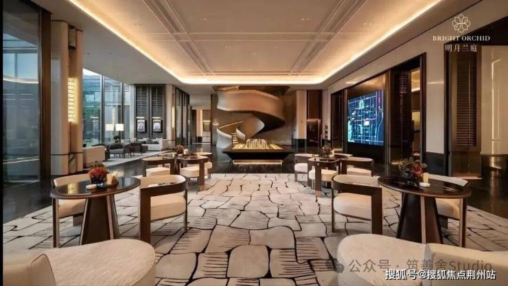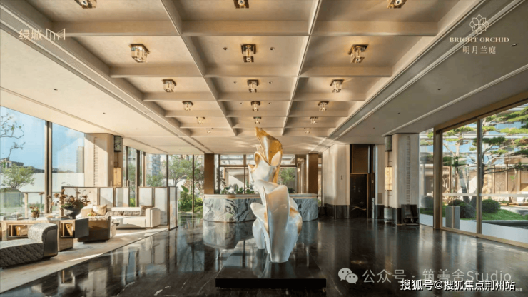 大门设计灵感源自世界顶奢安曼酒店,以宇宙黑奢石为基底,搭配两株精选造型的罗汉松,门口雕塑巧妙诠释“海上生明月”的美好愿景,尽显典雅与诗意。格栅嵌缀市花山茶花纹样,墨绿奢石铺陈沉稳底色,吊顶灯格如瓯绣编织天光每一处细节,皆在诉说归家即归礼的生活尊崇。