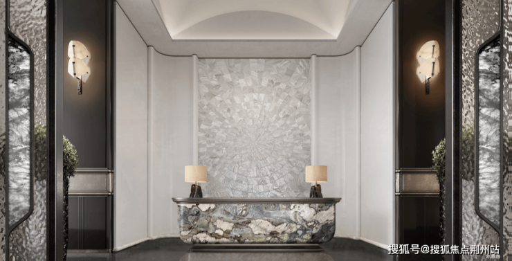 大门的水景基底,特别采用了贝壳形状设计,作为业主归家第一重礼序,约30米宽(含景墙),11米高的大门厅作为人行主出入口,彰显了恢弘尺度感与庄重感。