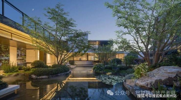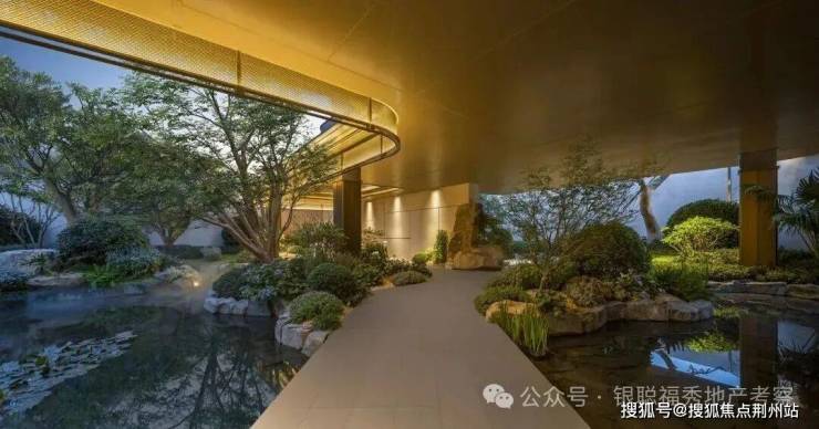 景观以「四境四巷」铺陈东方礼序,「五重归家」轴线串联宽约128米恢弘门庭、约15米叠石飞瀑、约13米榫卯转译的现代穹顶等。约1300㎡下沉式庭院采用三层立体观景设计,15米叠石飞瀑再现《溪山行旅图》的山水意境。