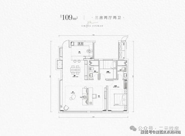 109㎡户型,是一个三房两厅两卫,三开间朝南,动静分离。