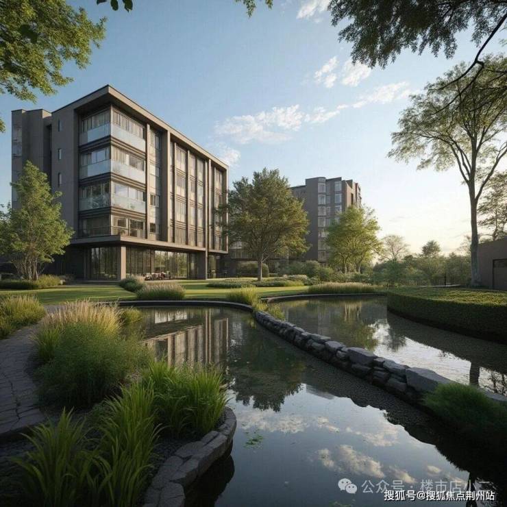 项目东北两侧被新江湾湿地生态系统包裹,形成了“双湾环抱-对望24万㎡湿地公园-内有庄园”的生态格局。楼栋采取东高西低策略,使超过半数楼栋可享受水系与公园景致。