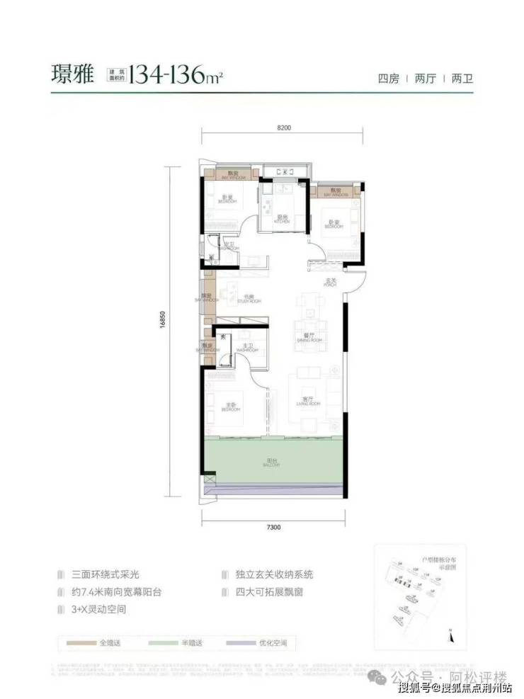 高得房率让项目户型的居住体验实现了越级提升,比如目前主推的建面约136平户型,实现四房功能性的同时,还具备非常强的室内空间阔绰感。做到上述空间的居住体验跃升,靠的是更大的阳台、更宽的大通厅、更大的主卧、更多的优化空间。