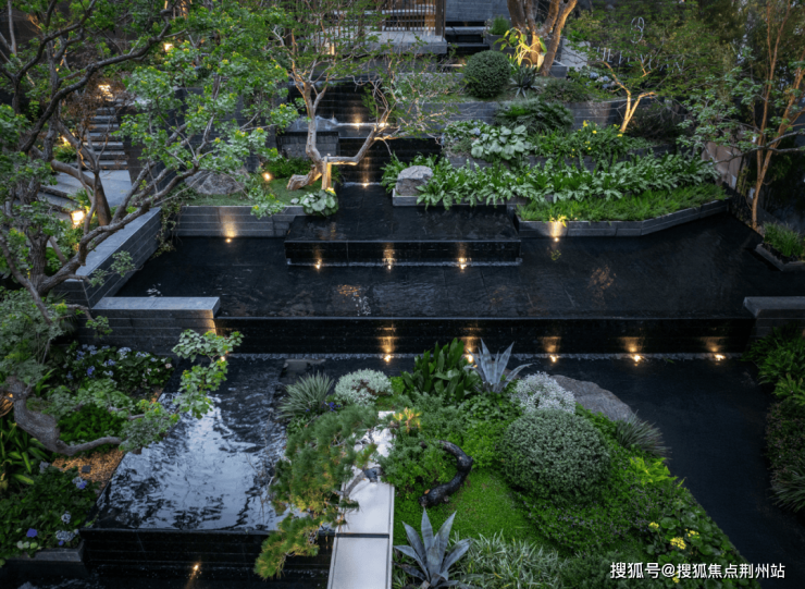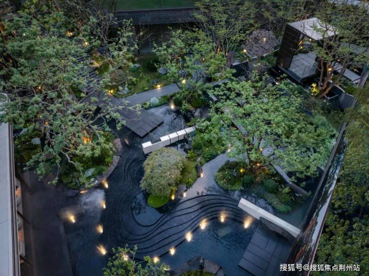 同时百年冬青撑开7.5米的华盖,186块乌金原石从太行山平移至此,银河流金奢石铺就的星河在水盘池底闪烁,仿佛将整片银河都收纳其中。