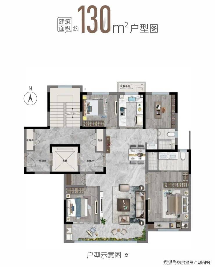 建面约130㎡户型:真正做到了“高得房率、丰富功能”,首先特别吸引人的就是:电梯独立入户,回家充满仪式感;