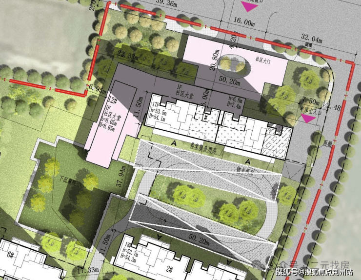 项目的社区大门、社区大堂都分布在1号楼附近,下沉庭院是由1、2、6、11号楼围合出来的一个空间。