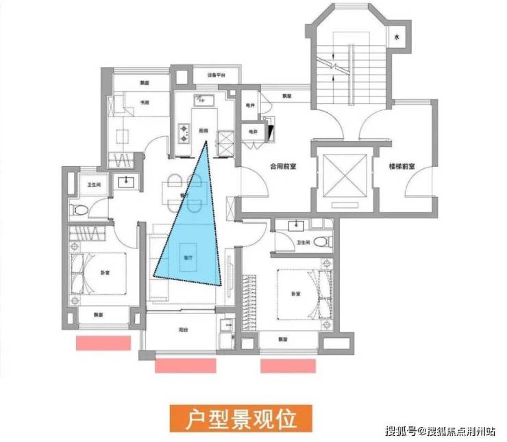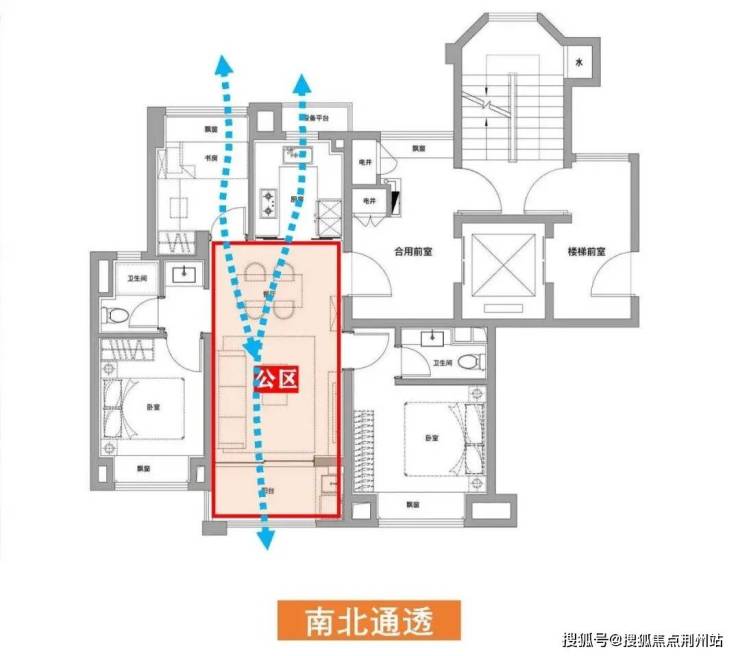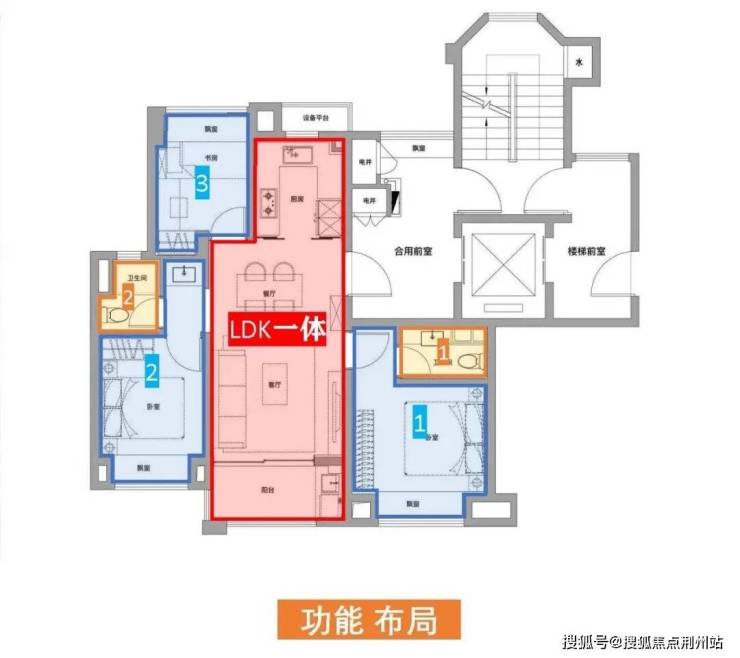 能在这么小的面积内做出3房2厅2卫,主要得益于项目的楼层只有14层,所以只要一部电梯和一部楼梯就能满足规范要求了。