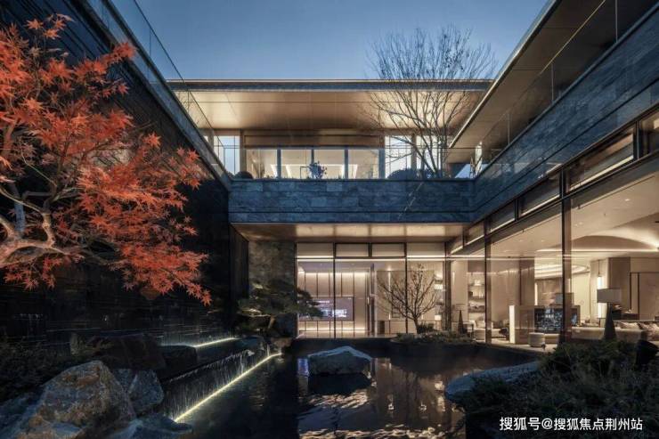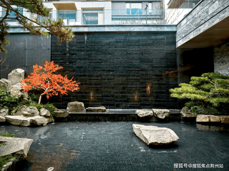 行至中庭水苑负一层,仿佛穿越进一幅中式山水画中,小桥、流水、假山叠瀑,青松红枫,布局简洁有致,在有限的空间里营造出精致的归家氛围,自然地再现了江南园林的美。