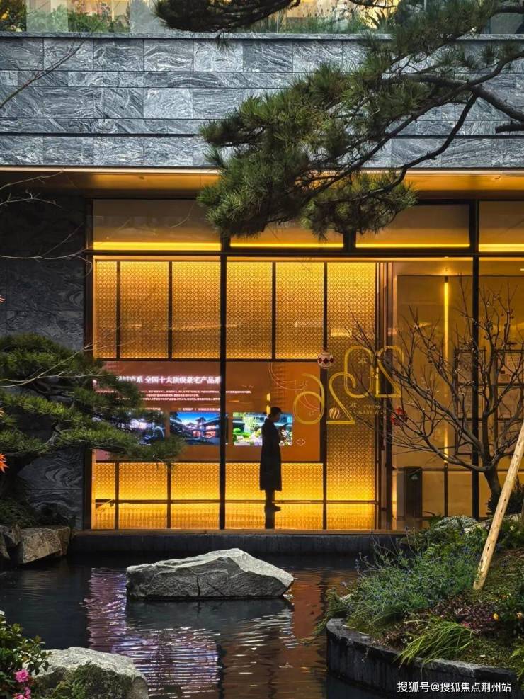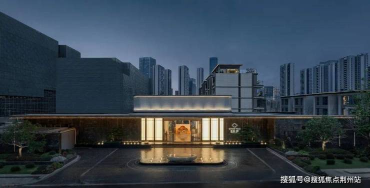 58米极致沿街展示面:黑松的苍劲古朴与大面的蓝钻奢石景墙形成对比与融合,营造出强烈的仪式感与尊贵感酒店式落客回车场地:形似莲花的聚宝盆水景,其独特造型将功能性空间提升为极具观赏性的艺术焦点,并带有财富汇聚、福泽绵长的美好开端