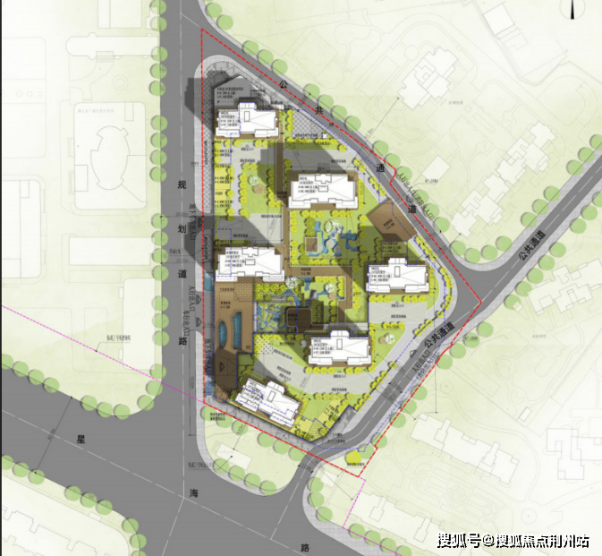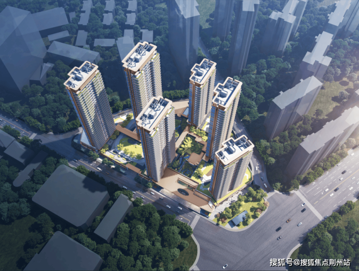 项目用地呈不规则多边形,整体布局6栋塔楼交错布置,增加正南北向楼栋数,并且减少楼栋间的相互影响,整体错落有序,高效利用土地与景观资源。