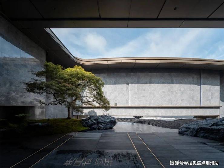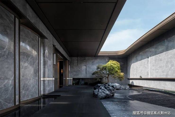 进入内院,游园汀步、微高差台地景观,将业主引至下沉庭院。“长江千里,烟淡水云阔。”描写长江的恢弘诗句,被还原到庭院设计中,演绎出一泻千里的江河气势。