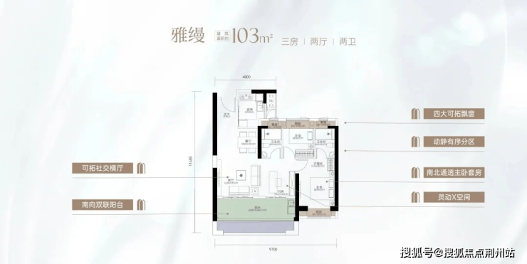 中间户建面103㎡,通过花池+飘窗的赠送,整体赠送面积18.87平,得房率超过90%,和客厅联通的X空间,可以做书房、茶室等空间,他的空间观感甚至可以比你看传统超高层120平要更大