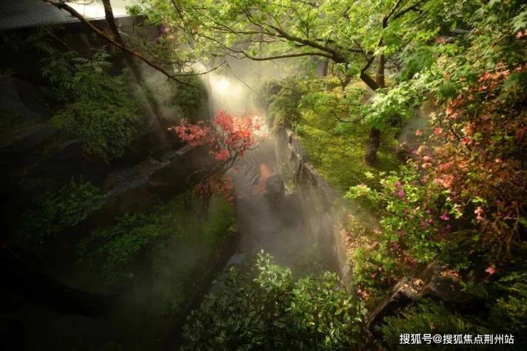 地形高差构筑立体色谱:低处铺展苔藓作底色;中层错落种植叶形各异的槭树科色叶群落构成视觉主调;高处点缀赤松群的流云树冠,一起形成一幅立体且具备四季变幻的山水画。
