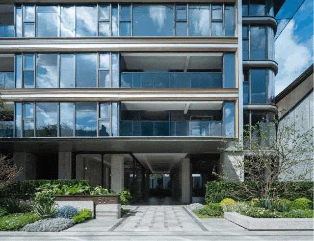 洋房采用玻璃曲线全面屏设计,蜂窝铝板+灰色玻璃材质,隐框平推窗消弭视觉断点。