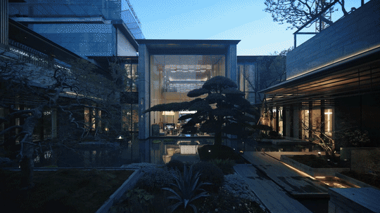 "潮鸣八境"里的四季庭·待霜溯源拙政园,全冠移植200年日本罗汉松,真正实现"推窗见水、枕河而居"。