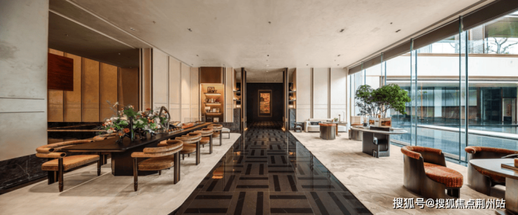 约700㎡下沉式庭院中,映入眼帘的是由景德镇大师定制的陶瓷云锦,两侧为沉香米黄大理石弧形定制景墙,搭配下方烧制的银杏片,贵气与雅奢扑面而来!