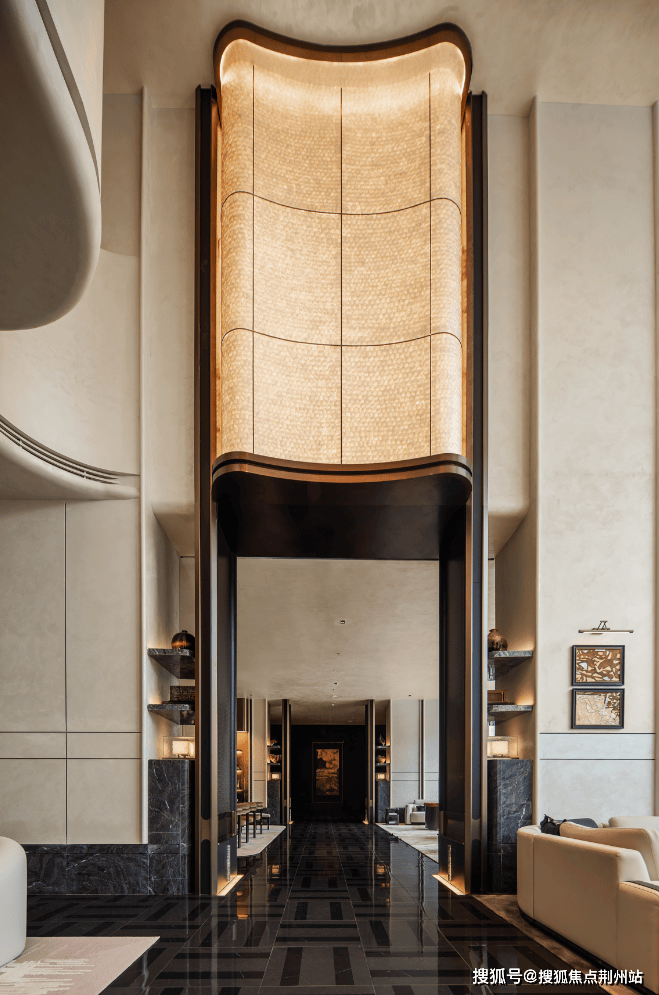 在生活美学馆,约8米挑高,大量石材上墙搭配顶部透光云石灯,雅奢气质拉满!未来在这里与亲朋畅聊或接待朋友,就是一个体面!