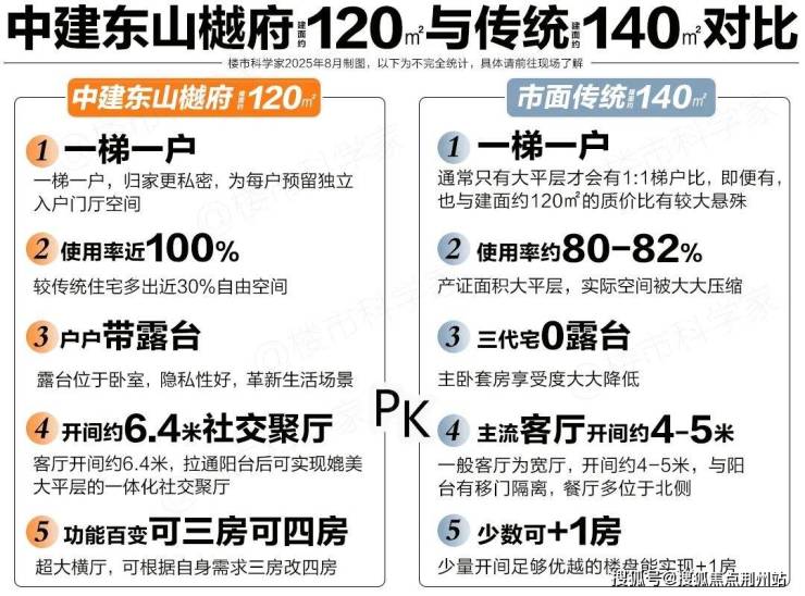 通常来讲140㎡高层实际利用率往往约80-82%,而中建东山樾府建面约120㎡则达到近100%,比同面积段传统产品多出约30%可利用空间。