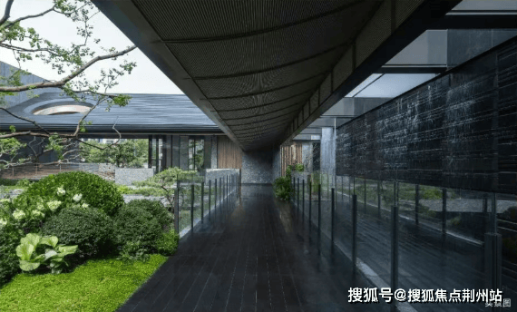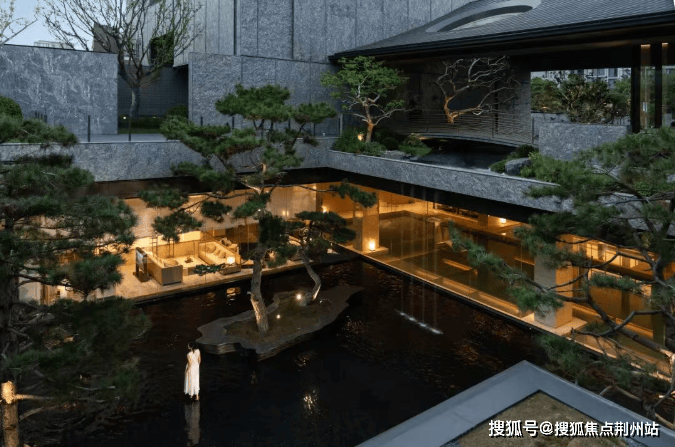 门庭之后,踏水归廊。以宋代「曲水流觞」的雅集中汲取灵感打造的「入园过渡空间」,归廊两侧是浅滩水景以手工雕刻的「安哥拉黑光面水切景石」形成「如波浪般的弧形纹理」,当水流经「潺潺轻响」行走其间,仿佛置身于「万家明月悬 秋浦,千尺飞虹锁暮流」的诗意场景。