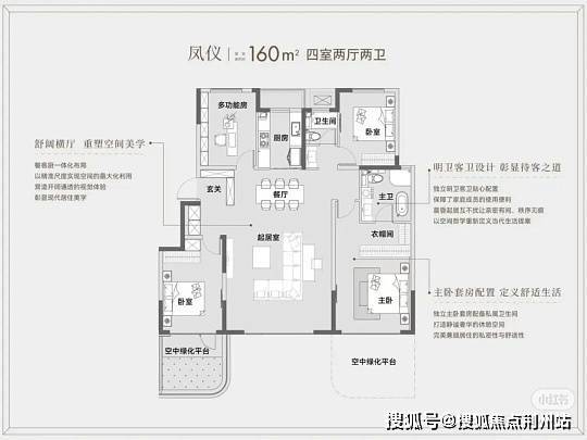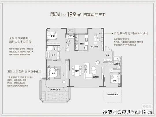 在户型设计上,绿城凤麟泰岳的三款户型都展现出了极高的尺度感。160平米和199平米的洋房均采用四叶草布局,四个角均设有卧室或多功能房,极大地提升了空间的利用率。露台位于南向的主卧或次卧,既保证了充足的采光,又为居住者提供了一个放松身心的空间。