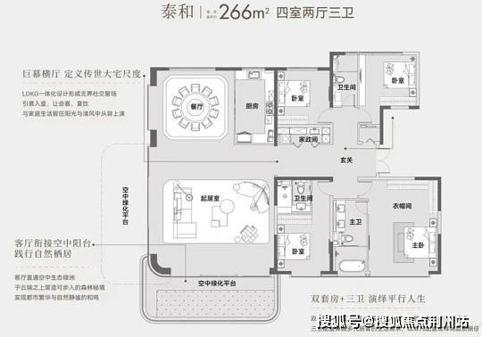 199平米的户型在餐厅位置上更加独立,与宽敞的客厅相连,而南向的次卧则升级为套间设计,增加了居住的私密性。与此同时,266平米的大平层户型则采用了大边厅设计,南向卧室均为主卧套间,功能性与舒适性兼备。户型内还设有家政间和储藏间,方便日常的家务处理和收纳,展现了高端住宅的精致生活理念。