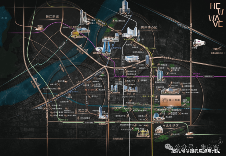 锦上观澜与地铁2号线建设一路站,直线距离仅约750米:4站盈丰路、5站钱江世纪城、6站钱江新城。