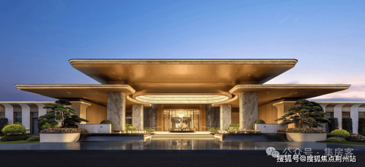 宽约78.8米、高约9.2米的大门,铺装大面积的梵高白奢石和古驰黑石材;四根梵高白立柱托起古铜色铝板;层层抬升,宛若步步登临殿堂。