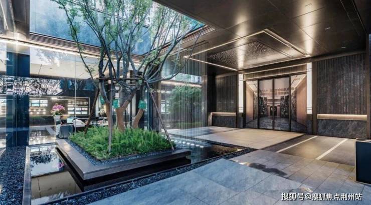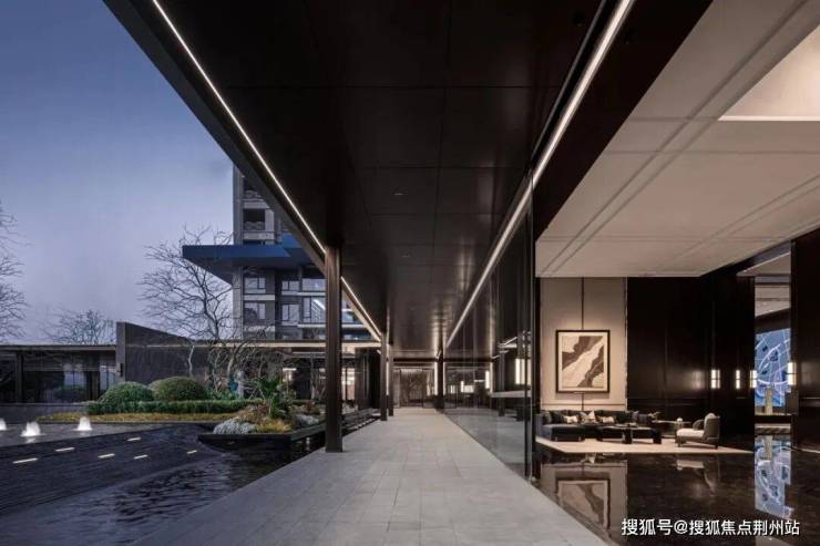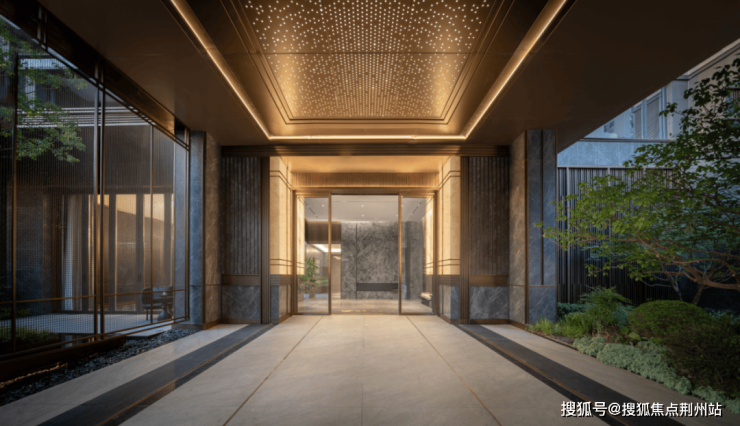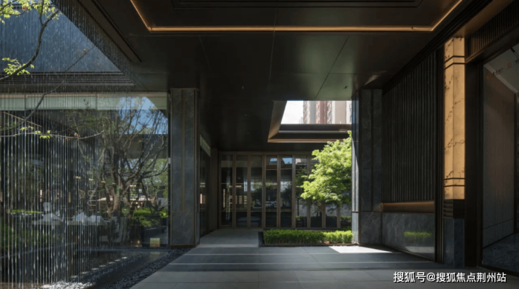 首层单元大堂与风雨连廊的设计风格和谐统一,运用仿石砖镶嵌金属条的设计手法,在电动门两侧布置发光云石灯柱,并在顶部吊顶安装星光顶,既提升了场域特性,又增强了昭示性。议事厅两侧结合单元入口,分别布置了两个小巧精致的庭院,加之景观水帘和金属网帘的搭配,为入口和架空层营造出更多自由与愉悦的氛围。