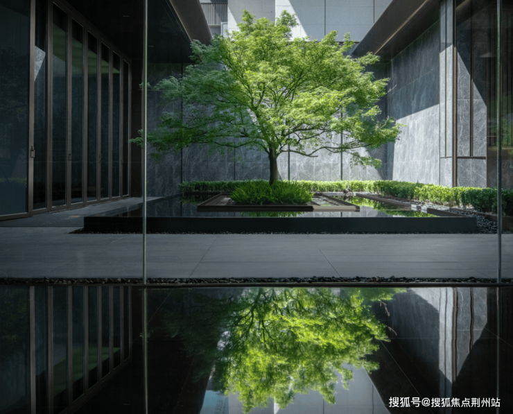 叠影之庭——设计灵感源于“江中晨雾”的层次感,在庭院中央孤植一棵迎宾姿态的乔木。江面泛起的涟漪被抽象为层层叠级的水台,各异的水面高差映衬出错落有致的树影。庭院因此得名“叠影”。
