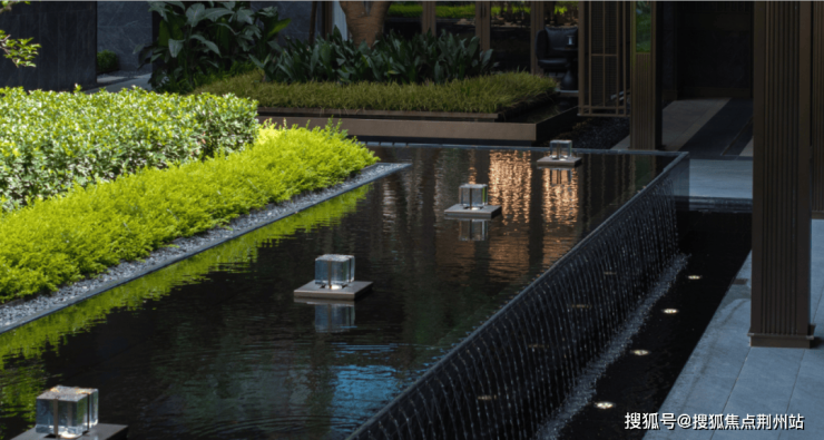 洽谈区入口精心设计,为您呈现核心区景观的极致美景。简洁明快的线条勾勒出整洁优美的场景,绿色植物与水景的巧妙交融、相互衬托,使空间层次更加丰富,营造出别致的光影效果。画面前景为涌泉水面,其上镶嵌精致条形奢石,营造出富有韵律感的美妙画面。