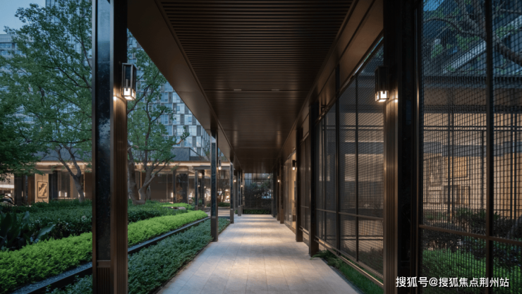 踏入这座“酒店”,率先映入眼帘的是连通整个小区的风雨连廊。这条连廊不仅仅是为了为业主提供遮阳避雨的场所,更是借鉴了度假型奢适酒店的设计理念,将园林与建筑无缝衔接,力求在空间功能性与舒适度之间寻求平衡。