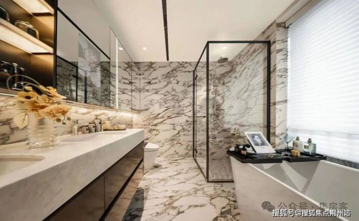 甚至主卫,也是香港瑰丽客房洗手间的足本复刻 ,黑白灰水墨岩板,装点出一间“私人水疗美术馆”。真正的奢侈,就是要让最功能性的空间也值得驻足欣赏。