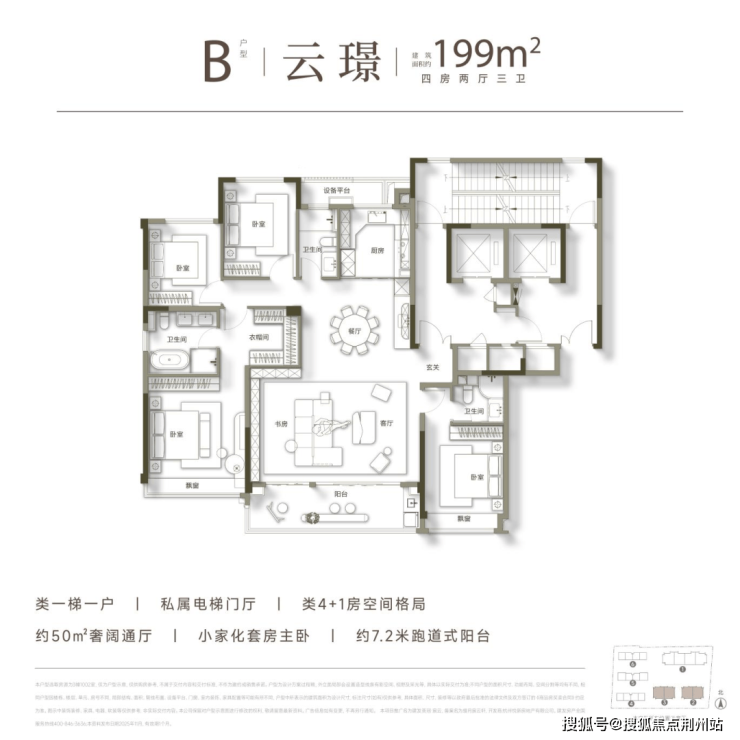 项目涵盖建面约199㎡观云奢宅&建面约371-452㎡中式排屋。高层类一梯一户,专属电梯前厅;采用洄游式通厅设计,LDKB一体化连通,跑道式双联阳台,主次卧均设计为套房。