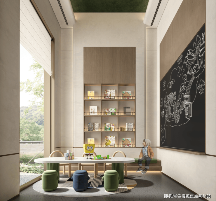 设计团队利用消防登高面,在地面划分上设置功能性图案场地。彩色儿童活动跑道,搭配洋溢着活力的地面认知图案,靠近边缘位置设置婴儿车停放点位,在登高面与连廊之前的位置放置色彩明亮的定制IP器械,提升主题生动趣味性,并配以秋千、跷跷板、摇摇乐等小型活动器械,满足各个年龄段儿童活动需求。