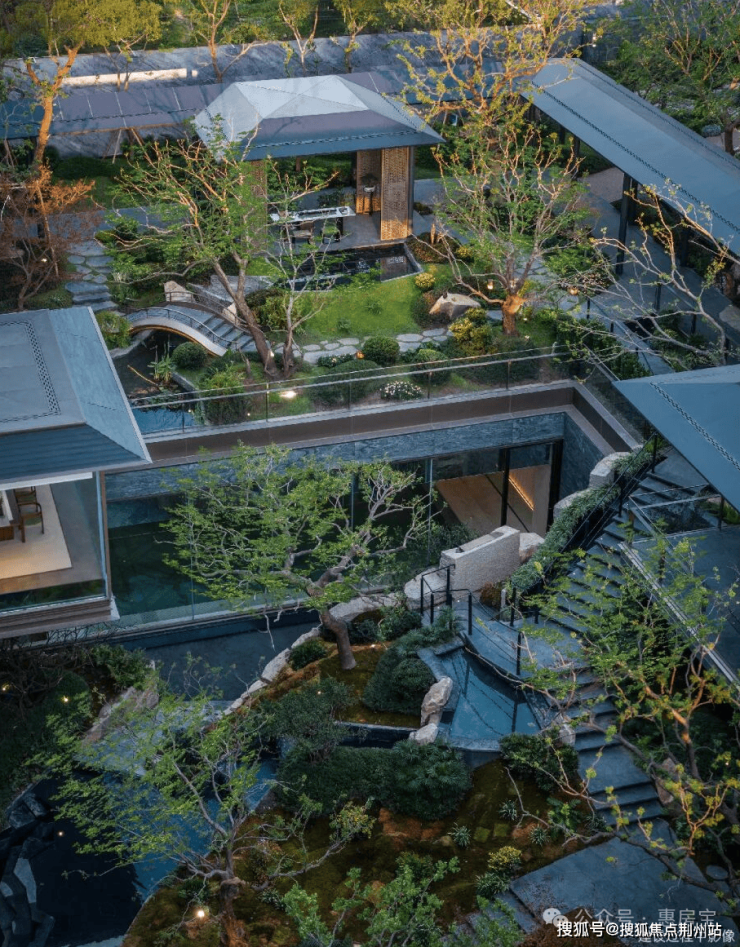 约6米地势差打造的下沉式山水庭院,山、石、水、林有序交织,犹如一幅“豁然开朗山水轴卷,每一步皆是景致,每一处皆有不同。